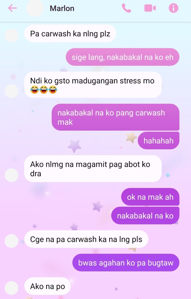 Him: Sige na, pa-carwash ka na lang.