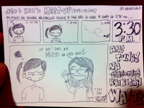 Nung dumalo ako sa awarding ng SBA, inasahan kong nandoon si Jec pero dahil wala siya, kinuha ko ang oportunidad na makipagkita sa kanya lalo nung nagyaya siya. Sabi niya, magkita daw kami ng patago, parang lovers lang eh. hahah